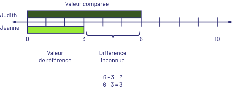 - Comparaison : Valeur de référence inconnue. Judith a 6 $ et Jeanne a 3 $ de moins que Judith. Combien de dollars Jeanne a-t-elle? OU Jeanne a 3 $ de moins que Judith. Judith a 6 $. Combien de dollars Jeanne a-t-elle?
