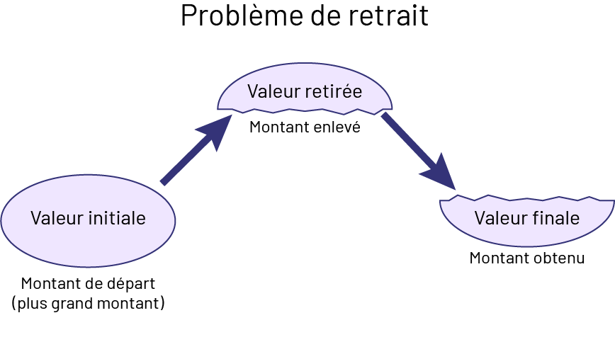 image Problème de retrait. L’image montre un ovale brisé en deux sur le sens de la longueur et un ovale intact. À gauche, on trouve l’ovale intact, nommé Valeur initiale. En dessous, il est écrit : « Montant de départ, plus grand montant ». Une flèche pointe vers la moitié supérieure de l’ovale brisé, nommée Valeur retirée. En dessous, il est écrit : « Montant enlevé ». Une flèche pointe vers la partie inférieure de l’ovale, nommée Valeur finale. En dessous, il est écrit : « Montant obtenu ».