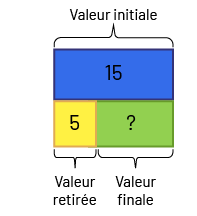 - Retrait : Valeur finale inconnue. Nadia a 15 $. Elle donne 5 $ à son frère. Combien lui reste-t-il de dollars à présent?