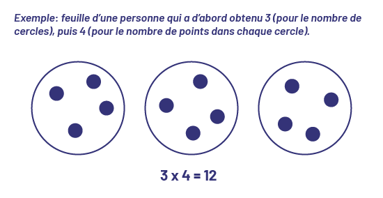 • écrit, ensuite, une phrase mathématique qui représente la multiplication (par exemple, si l’on a 3 cercles contenant 4 points chacun, il faut écrire 3 × 4 = 12).