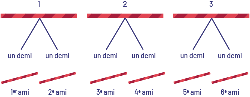 À trois reprises, un triangle sans base placé sous une réglisse pointe vers le milieu de celle-ci. Sous chaque segment, il est écrit « un demi ». Sous la première réglisse, il y a deux petites réglisses, respectivement attribuées au premier ami et au deuxième ami. Sous la deuxième réglisse, il y a deux petites réglisses, respectivement attribuées au troisième ami et au quatrième ami. Et sous la troisième réglisse, il y a deux petites réglisses, respectivement attribuées au cinquième ami et au sixième ami.