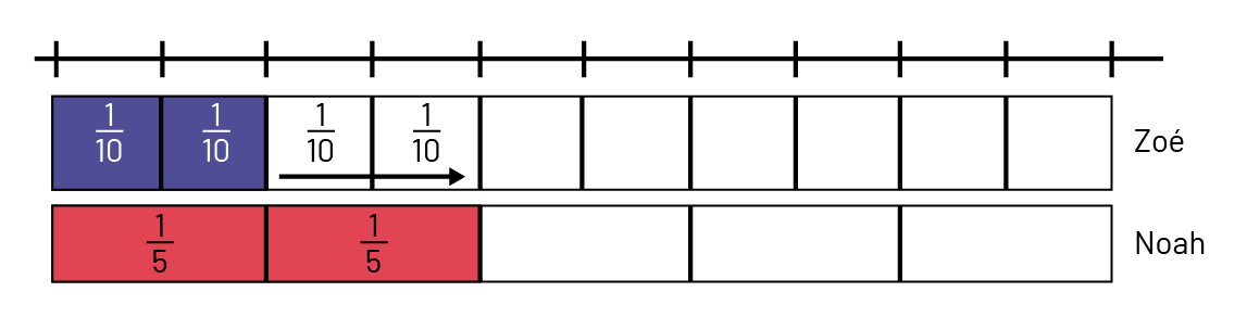 Je dessine \(\frac{2}{10}\) du tout sur une bande fractionnaire pour représenter le résultat de Zoé. Je représente aussi le résultat de Noah en dessinant \(\frac{2}{5}\) du tout sur une autre bande fractionnaire. En regardant les 2 bandes fractionnaires, je réalise que Noah a réussi à glisser sur une plus longue distance que Zoé. En effet, \(\frac{2}{5}\) ou 2 un cinquième est plus long que la bande de Zoé qui indique \(\frac{2}{10}\) ou 2 un dixième.