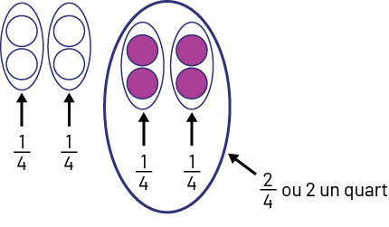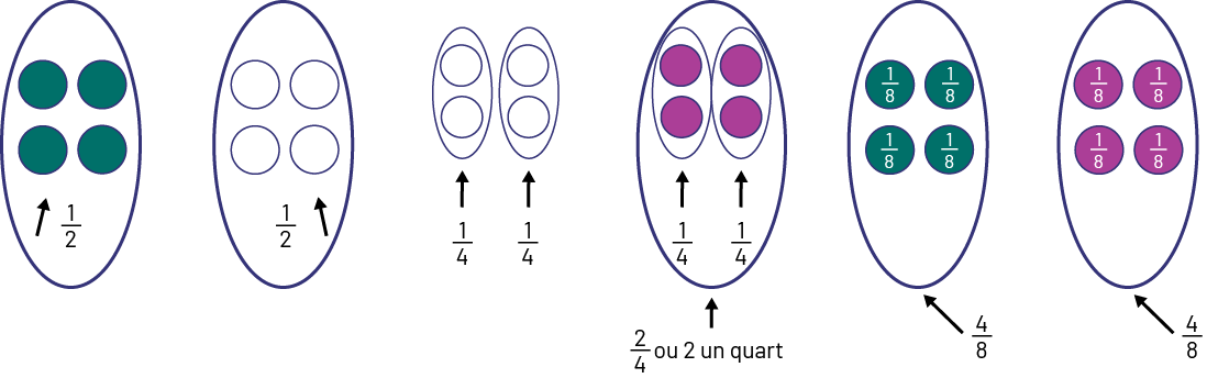 Image Deux ovales sont représentés. Dans chaque ovale, il y a 4 balles, celles de l’ovale de gauche sont vertes.Une flèche pointe les balles, on peut lire la fraction un demi.À côté on peut voir :8 balles sont placées sur 2 rangées de 4 balles chacune. Des ovales encerclent les balles 2 par 2, chaque ovale représente un quart des balles. Un grand ovale encercle 2 petits ovales, cela représente la fraction 2 sur 4 ou 2 un quart.Puis : Un ovale représente l’ensemble de 4 balles vertes. Chaque balle verte est annotée un huitième. L’ensemble représente la fraction 4 sur 8 ou 4 huitièmes.Un deuxième ovale représente l’ensemble de 4 balles violettes. Chaque balle est annotée un huitième. L’ensemble représente la fraction 4 sur 8 ou un huitième.