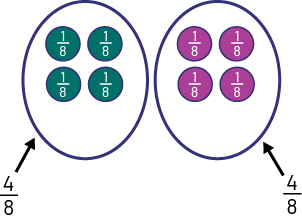 Image Un ovale représente l’ensemble de 4 balles vertes. Chaque balle verte est annotée un huitième. L’ensemble représente la fraction 4 sur 8 ou 4 huitièmes. Un deuxième ovale représente l’ensemble de 4 balles violettes. Chaque balle est annotée un huitième. L’ensemble représente la fraction 4 sur 8 ou un huitième.