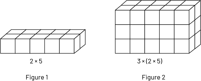Dans la figure 1, on voit qu’il y a 2 rangées de 5 cubes, soit \(2 \times 5\) cubes. Dans la figure 2, on voit 3 étages contenant chacun \(2 \times 5\) cubes. La figure représente donc \(3 \times (2 \times 5)\) cubes.