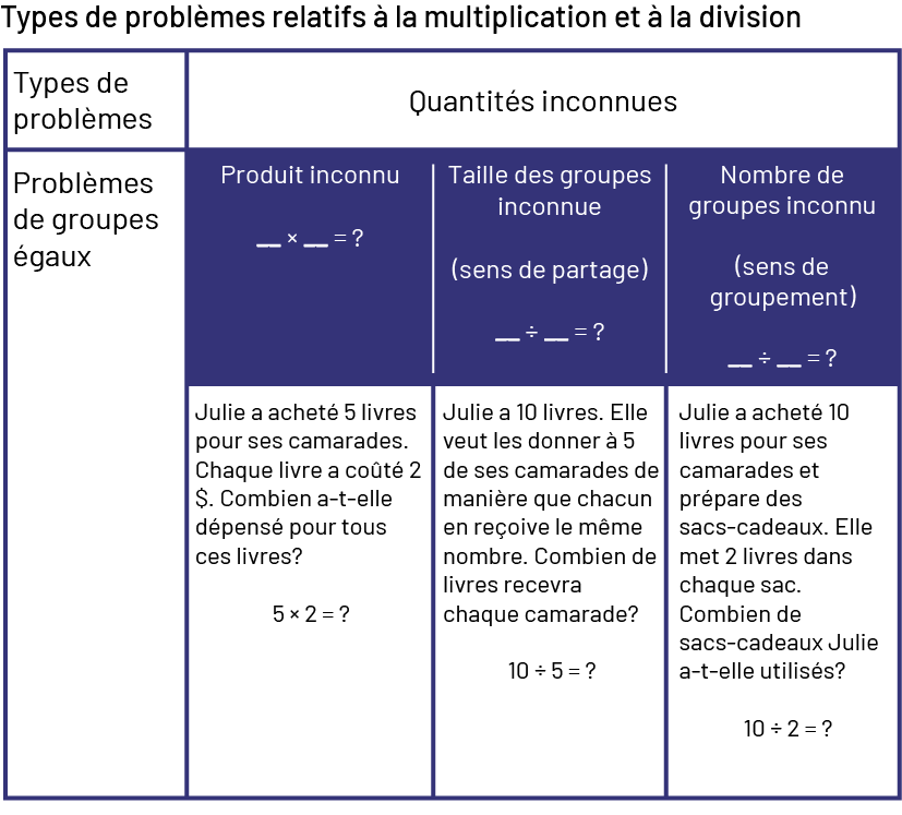 inconnu : Nombre multiplié par nombre égal inconnu. Exemple : « Julie a acheté 5 livres pour ses camarades. Chaque