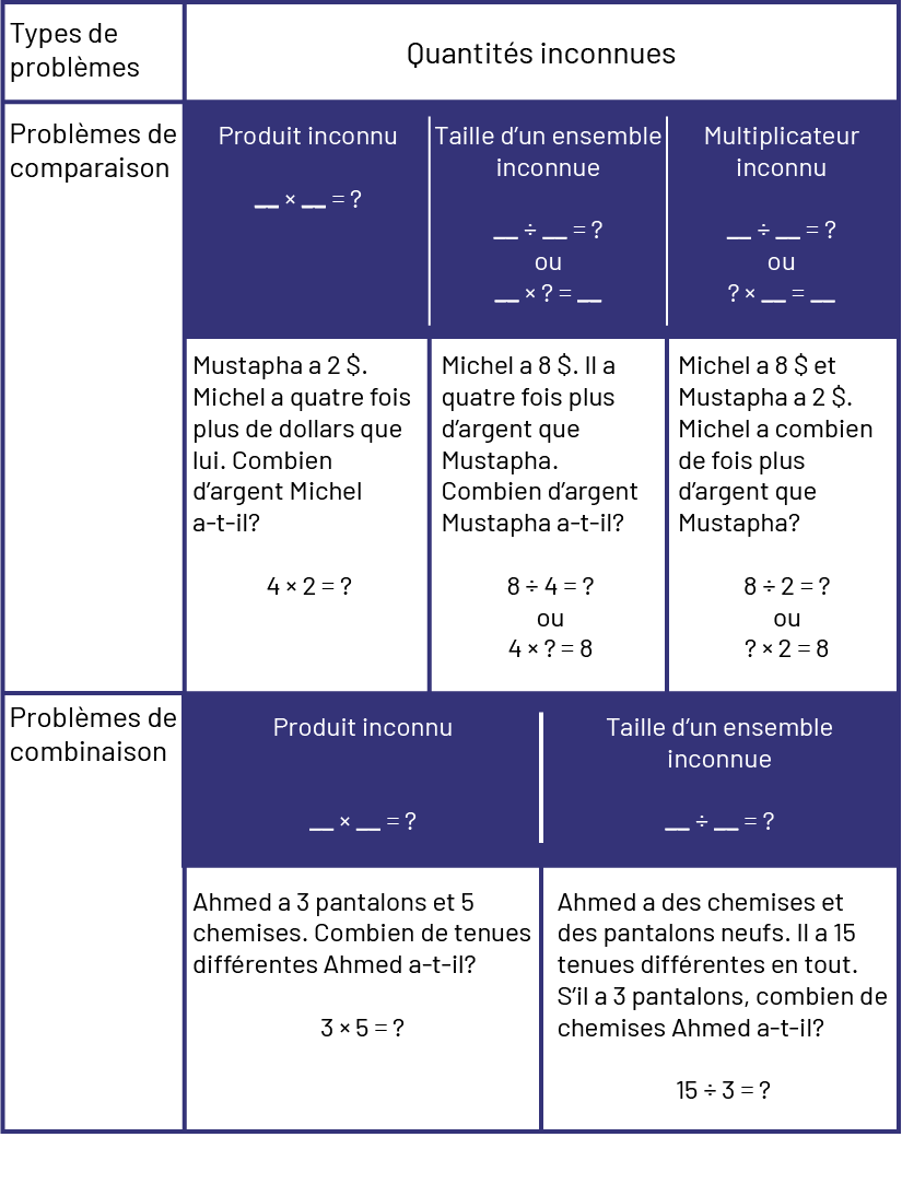 Il est essentiel de traiter des 2 types de problèmes, puisqu’ils sont la base de l’intégration d’autres concepts mathématiques. Il n’est pas nécessaire que les élèves sachent le nom des types de problèmes, mais il est essentiel qu’elles et ils aient l’occasion d’en résoudre de divers types, tout en employant une variété de stratégies.