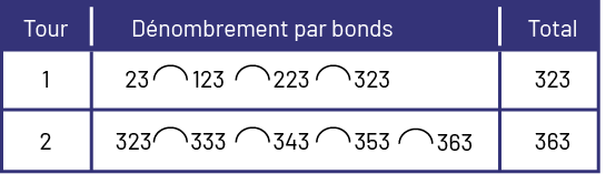 Image Tableau qui permet de noter le numéro du tour, le dénombrement par bonds et le total. Pour le tour un, 23, un bond, 123, un bond, 223, un bond, 323, total 323. Pour le tour 2, 323, un bond, 333, un bond, 343, un bond, 353, un bond, 363, total 363.