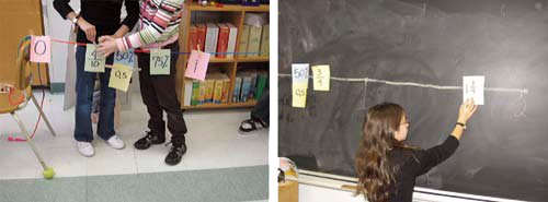 Photo un: on voit des élèves accrochant des cartons sur lesquels sont inscrites des fractions sur une corde à linge qui représente une droite numérique. Photo 2: on voit l’élève collant un carton sur lequel est inscrite une fraction sur une droite numérique dessinée au tableau.