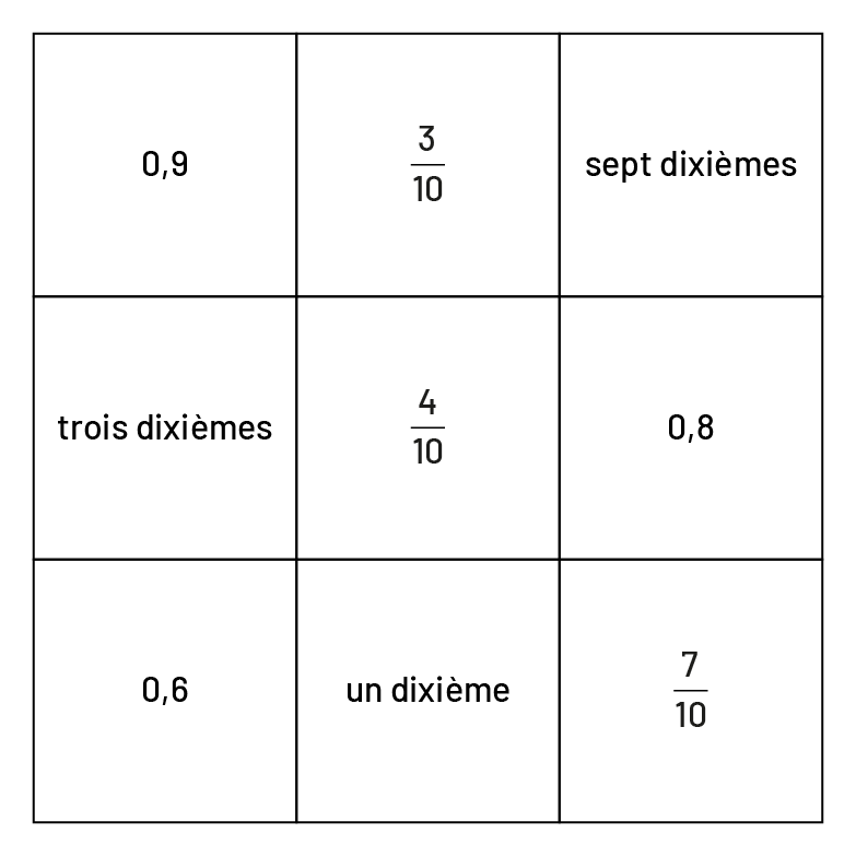 Demander aux élèves de remplir une grille de \(3\; \times \;3\) avec des nombres de un dixième à neuf dixièmes au choix, écrits soit en lettres, en notation décimale ou en notation fractionnaire.