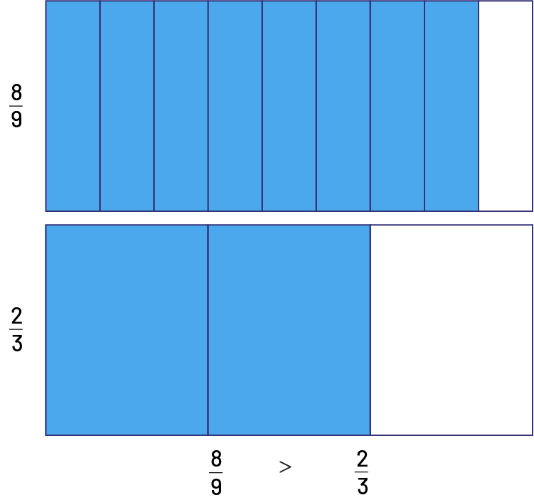 image La fraction 8 sur 9 est représentée par un rectangle divisé en 9 parties égales dont les 8 premières sont en bleu.La fraction 2 de 3 est représentée par un rectangle divisé en 3 parties égales dont les 2 premières sont en bleu.Les 2 rectangles sont de dimensions identiques. On peut y voir que les 8 parties en bleu du premier rectangle représentent une plus grande partie que les 2 parties en bleu du deuxième rectangle.8 sur 9 est plus grand que 2 sur 3.