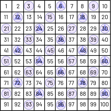 image Grille de nombres de, un à 100. Les multiples de 3 sont encerclés: 3, 6, 9, 12, 15, 18, 21, 24,