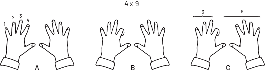 Un certain nombre d’élèves trouvent utile cette méthode kinesthésique pour se rappeler la table de 9. On demande aux élèves de tenir leurs mains devant eux, doigts écartés comme dans l’illustration. Leurs doigts (depuis le petit doigt de la main gauche) sont numérotés de 1 à 10 (A). Elles et ils doivent plier le doigt qui représente le multiplicateur de 9. Ainsi, dans la multiplication \(9\; \times \;4\), c’est le doigt numéro 4, soit l’index de la main gauche, qui est plié (B). Le nombre de doigts qui se trouvent à gauche du doigt plié représente le chiffre des dizaines, le nombre de doigts qui se trouvent à droite du doigt plié représente le chiffre des unités. Ainsi, dans cet exemple les 3 doigts à gauche du doigt numéro 4 représentent 3 dizaines, donc 30, et les 6 doigts à droite du doigt numéro 4 représentent 6 unités, donc 6, ce qui donne 36 (C).