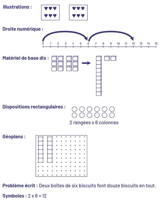 Les représentations de tous genres aident les élèves à faire des rapprochements entre les modèles, les symboles et les mots. On trouvera ci-dessous différentes représentations du fait numérique de base \(2\; \times \;6\) . Chacune des 7 représentations est appropriée. Rappelons seulement que les élèves éprouvent moins le besoin de recourir aux représentations visuelles à mesure qu’elles et ils développent certains automatismes pour résoudre les faits numériques de base.