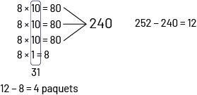 Je multiplie \(8 \times 10\), 3 fois. J’additionne les produits. Je soustrais 240 de 252, ce qui me donne 12. Je multiple 8 x 1, je peux donc distribuer 31 paquets par classe et il me reste 4 paquets.