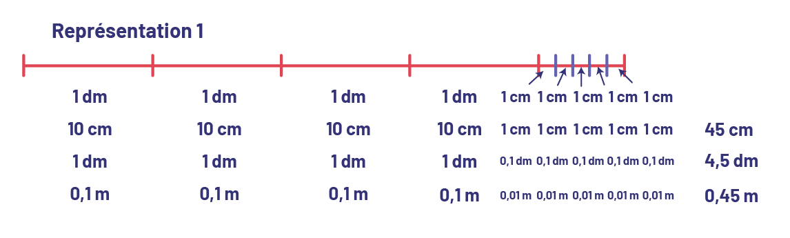 image Représentation 2.Quatre traits sont tracés, ils mesurent un décimètre. 5 traits plus petits sont en dessous, ils mesurent un centimètre. En additionnant, les traits mesurent 4 virgule 5 décimètres. Ensuite, diverses unités de mesure sont utilisées pour les traits, les centimètres, les décimètres et les mètres.Les grands traits mesurent dix centimètres et les petits traits un centimètre. En additionnant, on obtient 45 centimètres.Les grands traits mesurent zéro virgule un mètre, et les petits traits zéro virgule zéro un mètre. En additionnant, on obtient zéro virgule 45 mètre.