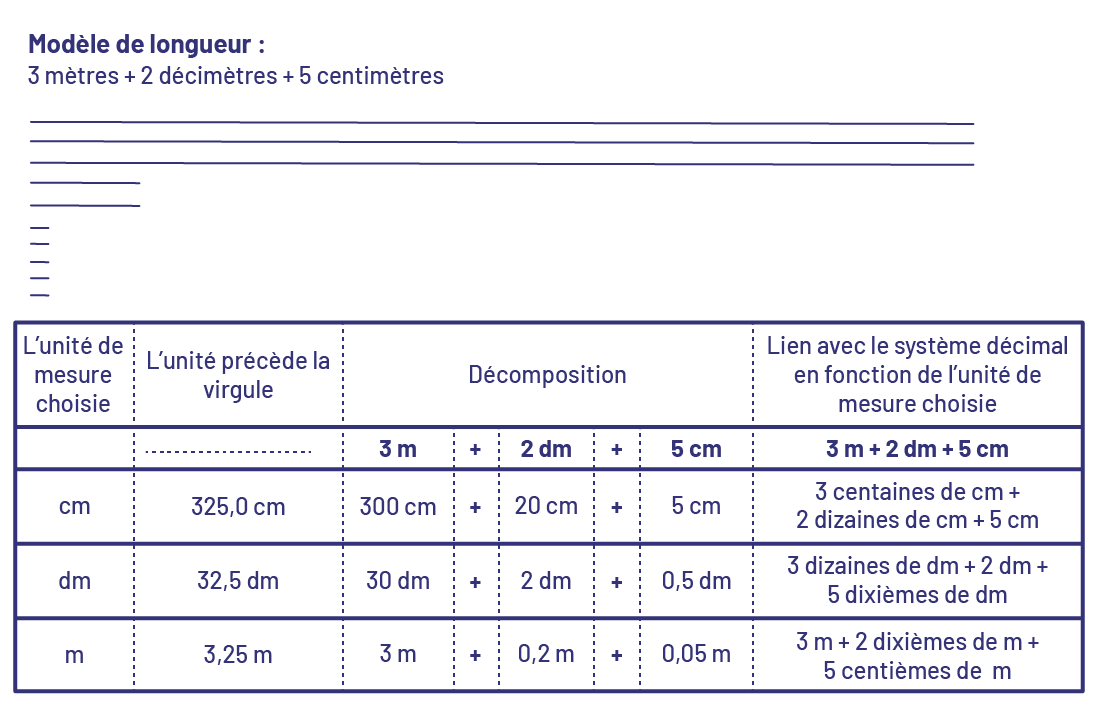 image Modèle de longueur :3 mètres plus 2 décimètres plus 5 centimètres.Les mesures sont représentées individuellement, par un trait qui illustre la corde.Dans un tableau, les renseignements suivants sont consignés :Colonne un :L’unité de mesure choisie : le centimètre, le décimètre et le mètre.Colonne 2 :L’unité précède la virgule . 325 centimètres. 35 virgule 5 décimètres. 3 virgule 25 mètres.Colonne 3 :Décomposition.3 mètres plus 2 décimètres plus 5 centimètres, ou,300 centimètres plus 20 centimètres plus 5 centimètres, ou 30 décimètres plus 2 décimètres plus zéro virgule 5 décimètre, ou,3 mètres plus zéro virgule 2 décimètre plus zéro virgule zéro 5 mètre.Colonne 4 :Lien avec le système décimal en fonction de l’unité de mesure choisie.3 mètres plus 2 décimètres plus 5 centimètres.