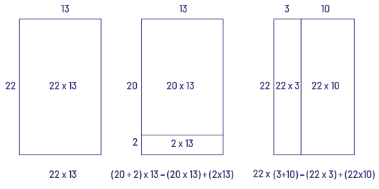 image Un rectangle de 13 par 22, on obtient la multiplication 22 fois 13.Un rectangle divisé en 2 parties, la première est de 13 par 20 et la deuxième de 13 par 2. On obtient la phrase mathématique suivante :(parenthèse ouvrante) 20 plus 2 (parenthèse fermante) multiplié par 13, égal (parenthèse ouvrante) 20 multiplié par 13 (parenthèse fermante) plus (parenthèse ouvrante) 2 multiplié par 13 (parenthèse fermante).Un rectangle divisé en 2 parties, la première est de 3 par 22, et la deuxième est de 10 par 22. On obtient la phrase mathématique :22 multiplié par 3 (parenthèse ouvrante) 3 plus dix (parenthèse fermante) égal, (parenthèse ouvrante) 22 multiplié par 3 (parenthèse fermante) plus ( parenthèse ouvrante) 22 multiplié par dix (parenthèse fermante).