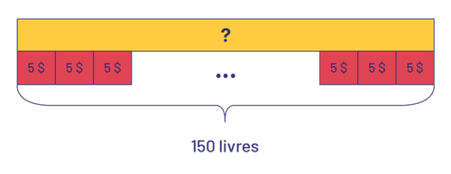 image Un rectangle jaune représente une inconnue.Sous ce rectangle, 6 carrés rouges, annotés 5 dollars. Ils sont répartis en 2 groupes, 3 carrés à la gauche, et 3 carrés à la droite. La totalité des carrés rouges représente 150 livres.
