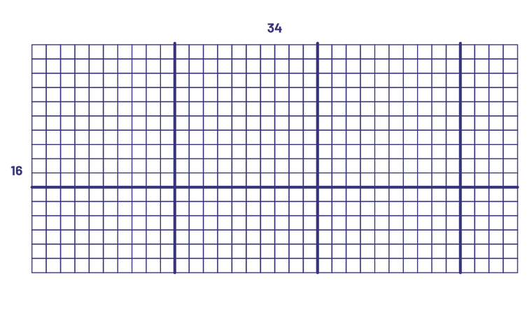 image Une disposition rectangulaire, tracée sur du papier quadrillé, de, 34 carreaux par 16 carreaux.Des traits en caractère gras ont délimité des carrés de dix carreaux par dix carreaux.On obtient 3 carrés de dix par dix, 3 rectangles de 6 par dix, un rectangle de dix par 4 et un rectangle de 6 par 4.