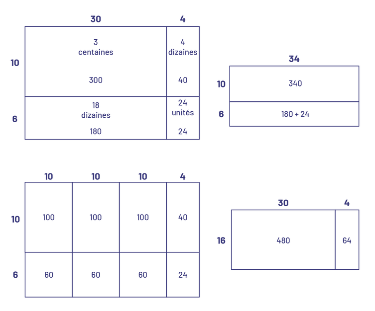 image Une disposition rectangulaire. La longueur est de 30 plus 4, la largeur est de dix plus 6. Il y a 4 rectangles dans la disposition rectangulaire.Le premier représente 3 centaines, 300.Le deuxième, 18 dizaines, 180.Le troisième représente, 4 dizaines, 40.Le quatrième représente, 24 unités, 24.Une disposition rectangulaire a 34 en longueur et dix plus 6 en largeur. Il y a 2 rectangles dans la disposition rectangulaire, le premier représente 340, le deuxième 180 plus 24.Une disposition rectangulaire, la longueur est, dix plus, dix plus, dix plus 4. La largeur est de dix plus 6. Dans la disposition rectangulaire, il y a, 3 rectangles qui représentent 100, 3 rectangles qui représentent 60, un rectangle qui représente 40 et un rectangle qui représente 24.Une disposition rectangulaire dont la longueur est 30 plus 4, et la largeur 16. La disposition rectangulaire a 2 rectangles qui représentent 480 et 64.