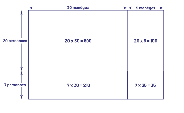 image Une disposition rectangulaire de 30 manèges plus 5 manèges sur la longueur et de 20 personnes plus 7 personnes sur la largeur.La disposition rectangulaire est divisée en 4 rectangles :Le premier représente, 20 fois 30 égal 600.Le deuxième représente, 20 fois 5 égal 100.Le troisième, 7 fois 30 égal 210.Le quatrième, 7 fois 35 égal 35.