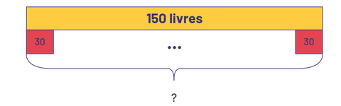 image Un rectangle jaune représente 150 livres. En dessous 2 carrés rouges représentent 30. Un espace vide est entre les 2 carrés rouges. L’espace vide plus les carrés rouges représentent une inconnue.150 divisé par 30 égal une inconnue.Ou une inconnue fois 30 égal 150.