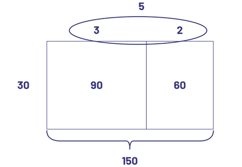 image Une disposition rectangulaire, la longueur est de 3 plus 2 pour un total de 5, et de 30 sur la largeur. Les 2 rectangles qui sont dans la disposition représentent 90 et 60 pour un total de 150.