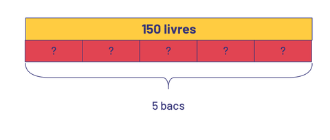 image Un rectangle jaune représente 150 livres. En dessous il y a 5 rectangles plus petits, qui représentent 5 bacs.150 divisé par 5 égal une inconnue. Ou, 5 fois une inconnue égal 150.