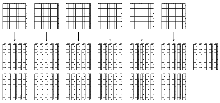 image 6 planchettes de centaines, sous chaque planchette une flèche pointe vers le bas où 10 réglettes de dizaines sont placées en groupes de 5.Il y a donc un total de 60 réglettes de dizaines, sous les planchettes, plus 5 autres réglettes de dizaines sur le côté.