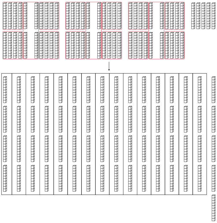 image 13 ensembles de 5 réglettes de dizaines sont disposés sur 2 rangées. Des ensembles de 4 réglettes de dizaines sont formés. Il reste 5 dizaines à part. Une flèche pointe vers le bas, Les réglettes de dizaines sont maintenant placés en 16 connes. 15 colonnes forment 15 ensembles de 4 réglettes de dizaines, et une colonne a 5 réglettes de dizaines.