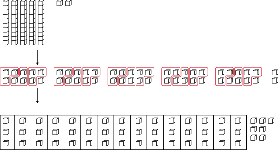 image 5 réglettes de dizaines et 2 unités sont divisées en groupes de dix unités individuelles. Ces unités sont en ensemble de 3. Il reste pour chaque groupe une unité et il y a 2 unités sur le côté qui ne font pas partie d’un groupe de dix. On obtient une disposition de 15 colonnes de 3 blocs d’unités, et un groupe de 7 blocs d’unités.