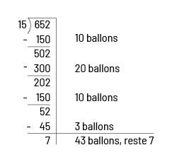 Les élèves peuvent alors conclure que chaque amie recevra 43 ballons (4 dizaines et 3 unités) et qu’il restera 7 ballons (652 ÷ 15 = 43, reste 7).