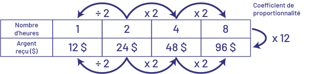 Dans cette table de valeurs, on peut également reconnaître qu’il existe une relation de proportionnalité entre le nombre d’heures travaillées et le montant d’argent reçu, soit × 12. Le coefficient de proportionnalité est de 12. On multiplie le nombre d’heures travaillées par 12 pour obtenir le montant d’argent reçu.