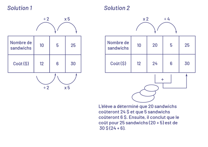 et que 5 sandwichs coûteront 6 dollars. Ensuite, il conclut que le coût pour 25 sandwichs (parenthèse ouvrante) 20
