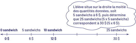 12 dollars, 25 sandwichs coûtent 30 dollars.L’élève situe sur la droite la moitié des quantités données, soit 5