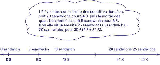 L’élève situe sur la droite des quantités données, soit 20 sandwichs pour 24 dollars, puis la moitié des quantités