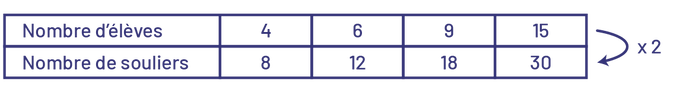 image Table de valeurs du nombre d’élèves et du nombre de souliers.Pour 4 élèves il y a 8