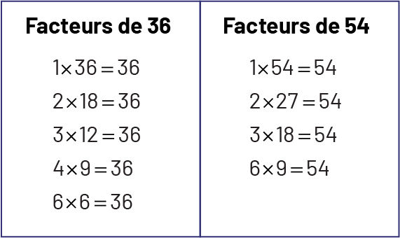 Quatre fois neuf égale 36. Et six fois six égale 36. Deuxième liste : Facteurs de 54. Une fois 54 égale 54. Deux fois
