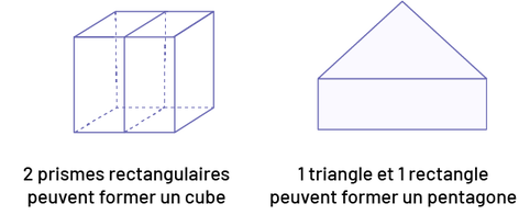 image Deux figures. La première image est : « un prisme rectangulaire. » Sous l’image est écrite: « 2 prismes rectangulaires peuvent former un cube. » La deuxième image est un : « pentagone. » Sous le pentagone est écrit : « un triangle et un rectangle peuvent former un pentagone. »