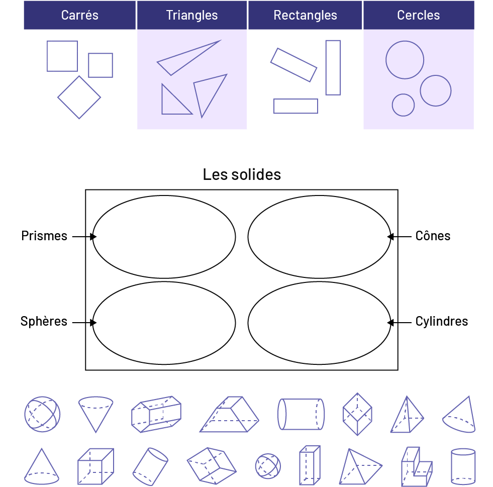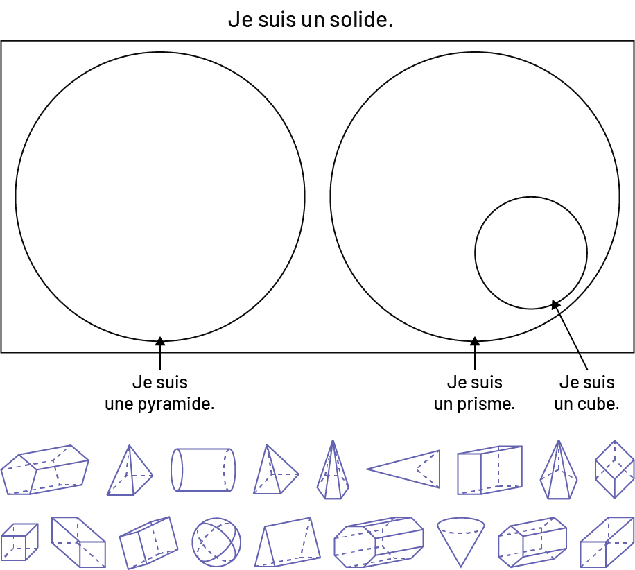 Avec le temps, l’élève se rend compte que les familles de formes géométriques ont des propriétés communes (par exemple, tous les prismes ont deux bases congruentes) et que les sous-ensembles ont des propriétés distinctes (par exemple, tous les prismes ayant des triangles comme bases s’appellent des prismes à base triangulaire).