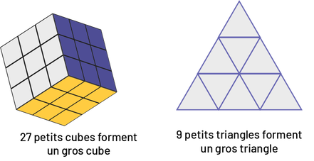 Image Première image un « cube rubic, » sous le cube est écrit: « 27 petits cubes forment un gros cube. » La deuxième image est un : « triangle » sous le triangle est écrit: « 9 petits triangles forment un gros triangle.