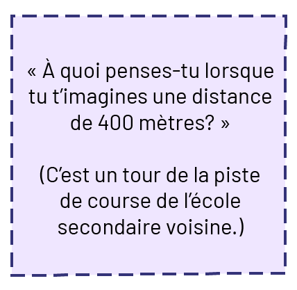 Image Dans un encadré on peut lire : « À quoi penses-tu lorsque tu t’imagines une distance de 400 mètres ? » (Parenthèse ouvrante) C’est un tour de la piste de course de l’école secondaire voisine (parenthèse fermante)