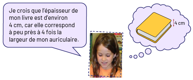Image Le visage d’une élève, une bulle de parole lui est associée. On peut y lire : « JE crois que l’épaisseur de mon livre est d’environ 4 centimètres, car elle correspond à peu près à 4 fois la largeur de mon auriculaire » . Une bulle de pensées est associée à l’élève, on peut y voir : « le livre et une double flèche à l’épaisseur, 4 centimètres.