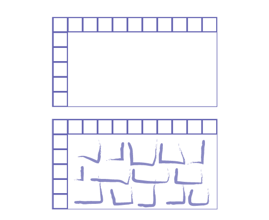 Les élèves qui n’ont pas compris la structure associée aux unités d’aire ne visualisent pas que les unités sont organisées de façon ordonnée en colonnes et en rangées. Elles et ils ont tendance à recouvrir la surface du rectangle de façon plus ou moins aléatoire à l’aide d’unités de grandeur variable et ont ensuite de la difficulté à dénombrer ces unités.