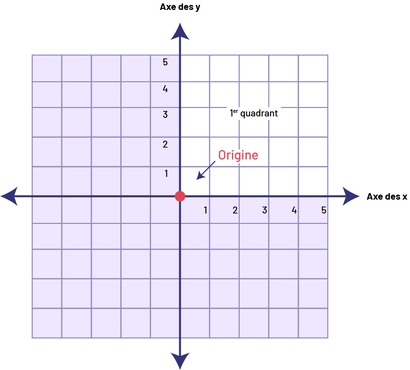 Les axes x et y divisent le plan cartésien en quatre régions appelées quadrants. Les élèves de 4e année utilisent seulement le quadrant au haut et à la droite dans le plan cartésien, soit le premier quadrant.
