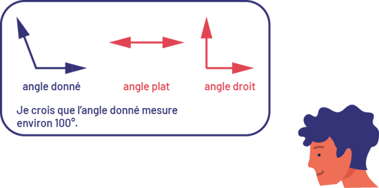 Pour estimer la mesure d'un angle donné, les élèves peuvent utiliser l'angle droit et l'angle plat comme repères. En superposant mentalement l'image de ces angles sur l'angle donné, ils peuvent conclure que sa mesure est beaucoup plus près de 90o que de 180o. Ils estiment alors que la mesure de l'angle donné est d'environ 100o. image Dans un rectangle arrondi se trouvent trois