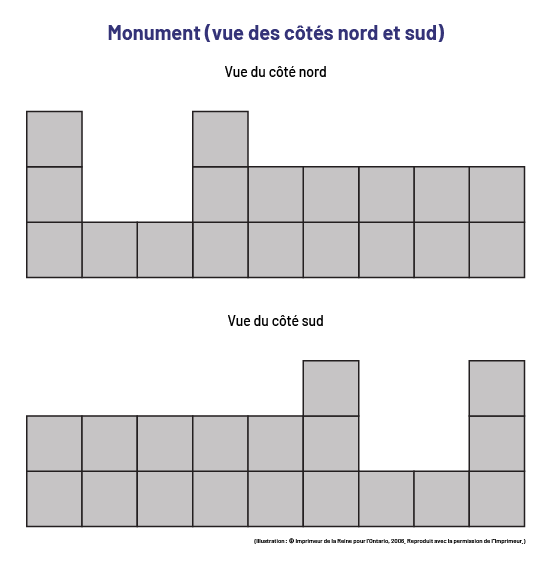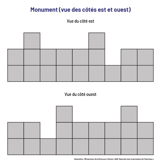 Former des équipes de deux élèves. Leur demander de construire une maquette quelconque avec un nombre donné de cubes emboîtables (par exemple, 15 cubes) et de tracer les vues de face, de côté et de dessus de cette maquette. Regrouper ensuite les équipes deux à deux et les identifier (par exemple, équipes A et B). Donner les explications suivantes :