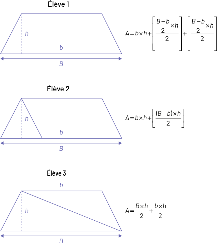 Image Élève un : Un trapèze, dont la base est nommée « b » majuscule, est divisé en 3 parties. Deux lignes pointillées sont tracées, elles représentent la hauteur « h »; cela forme les 2 triangles. Le rectangle a la largeur « h » et la longueur « b ». « A » égal, « b » multiplié par « h », plus [crochet ouvrant] « B » moins « b », divisé par 2, multiplié par « h », divisé par 2 [crochet fermant] plus, [crochet ouvrant]« B » moins « b » divisé par, 2 multiplié par « H », divisé par 2 [crochet fermant]. Élève 2 : Un trapèze dont la base est nommée « B » majuscule, est divisé en 2 partie, soit un triangle équilatéral et un parallélogramme. La hauteur du triangle est « H » et la base du parallélogramme est « b ». « A » égal, « b » multiplié par, « H » plus [crochet ouvrant] (parenthèse ouvrante) « B » moins « b » (parenthèse fermante) multiplié par « h », divisé par 2 [crochet fermant].Élève 3 : Un trapèze dont la base est nommée « B » majuscule, est divisé en 2 parties. Soit 2 triangles scalènes. La hauteur du premier triangle est « h », et la base du deuxième triangle est « b ». « A » égal, « b » multiplié par « h », divisé par 2 plus « B » multiplié par « H », divisé par 2.