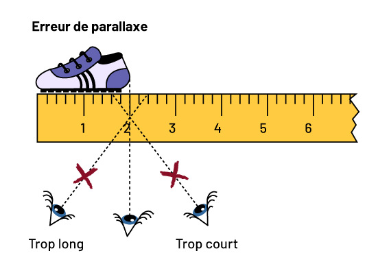 Image Il y a une règle de six centimètres. Au-dessus de la règle, il y a un soulier. En-dessous, il y a trois yeux. À partir de chaque œil, il y a une ligne pointillé lié à la règle. Il y a un « x » sur la première et la troisième ligne pointillée.